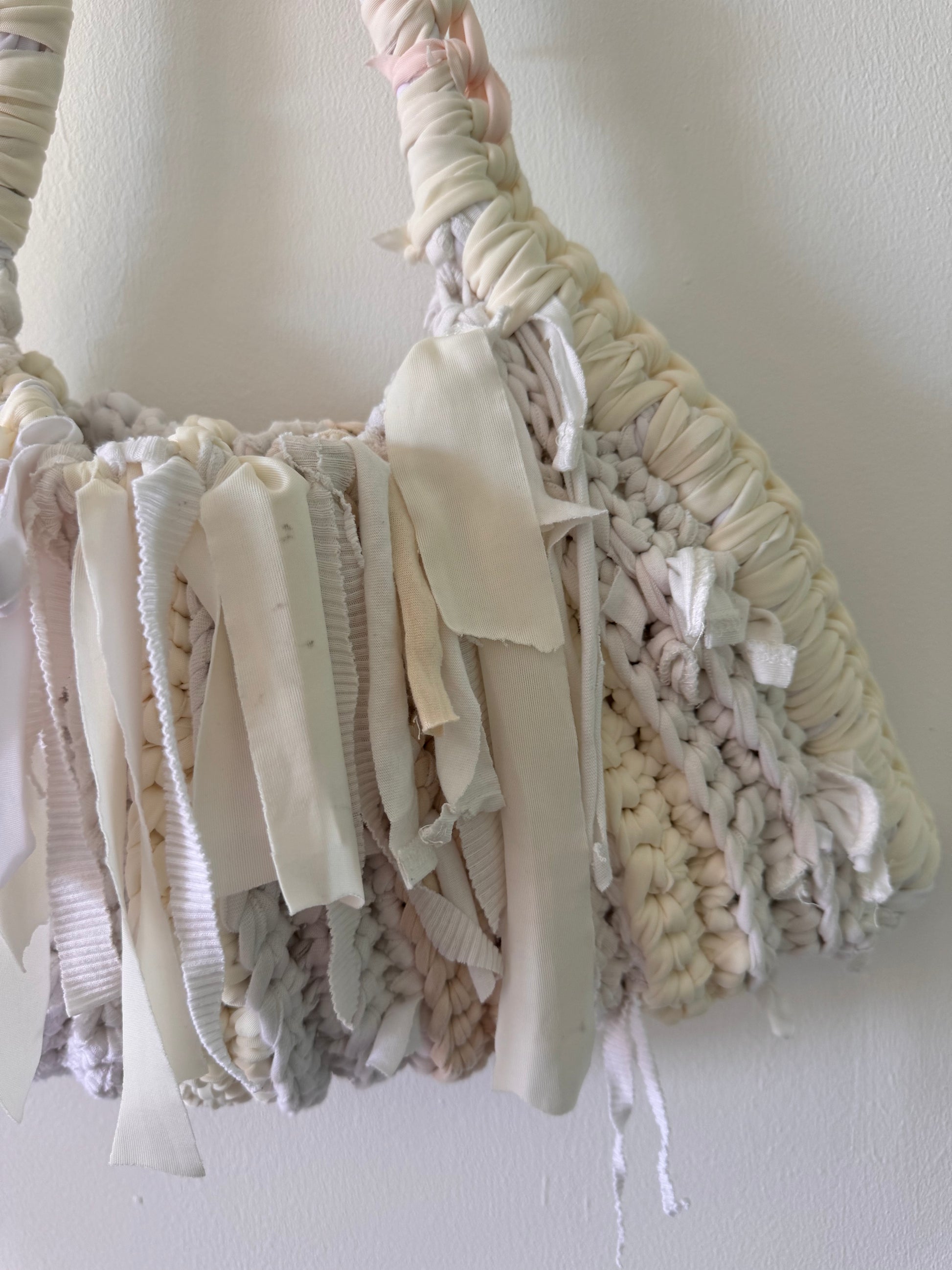 Made entirely of handmade up-cycled t-shirt yarn and yarn scraps, it's characterised by a unique fringe texture in the front and a "cleaner" look in the back.