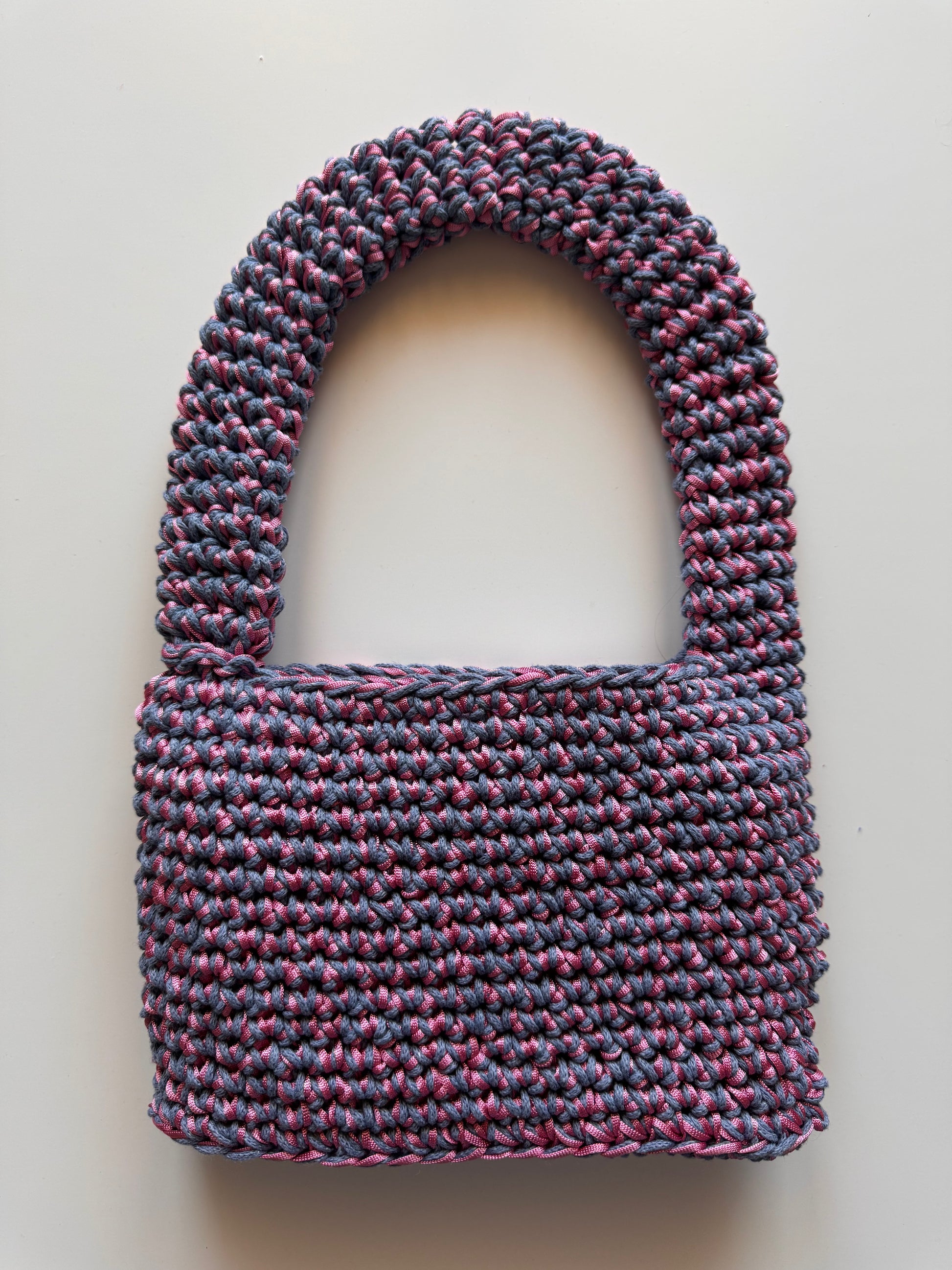A mix of macramé denim and pink lurex yarn guarantees a sturdy and stable structure.