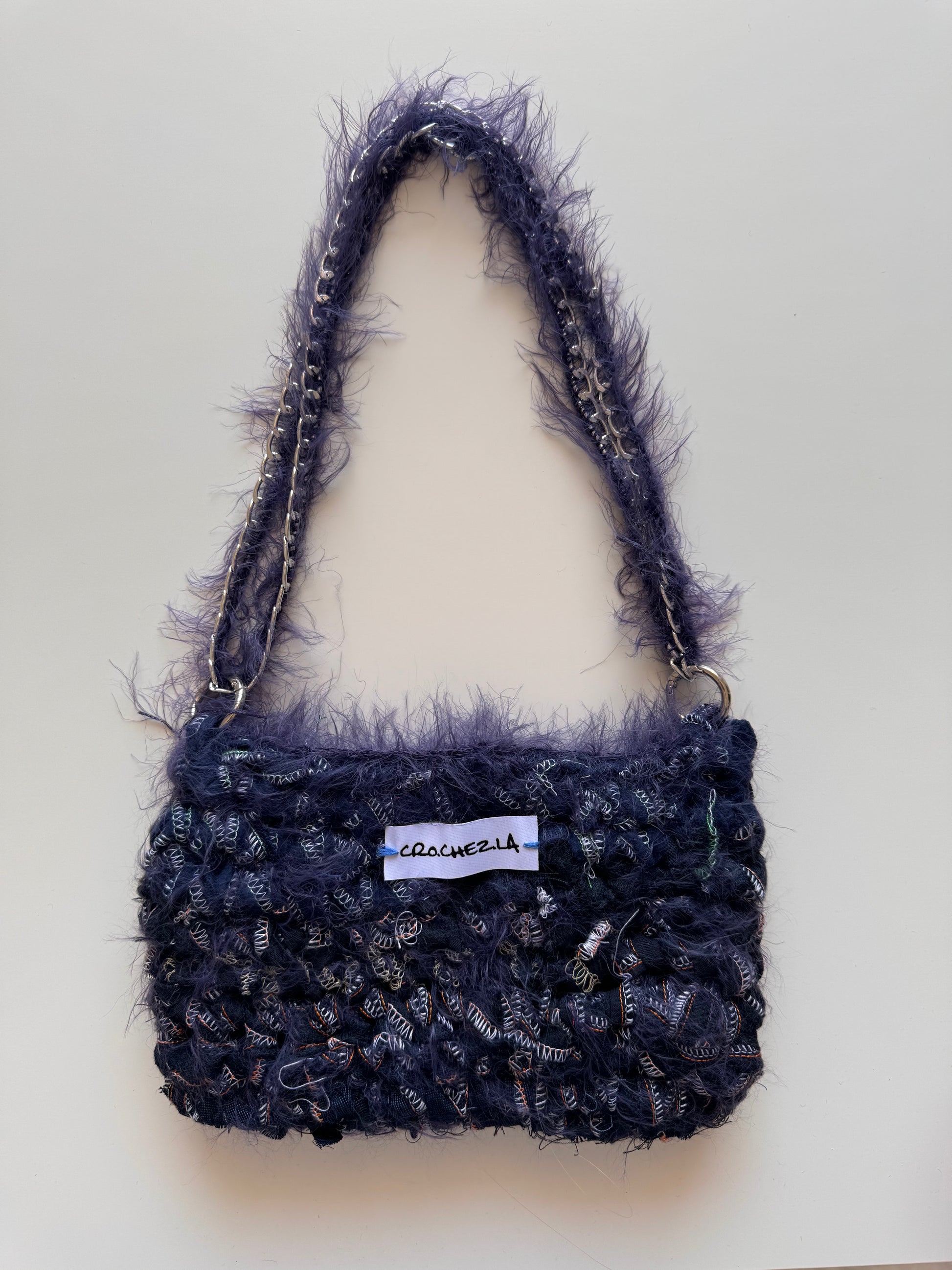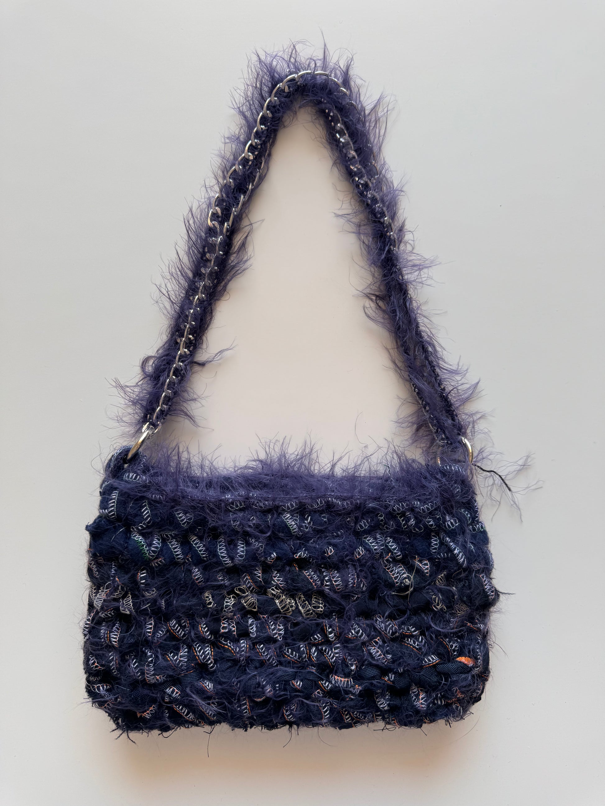 A mix of blue handmade up-cycled fabric yarn alternating with a second hand fur thread ensures a unique texture sturdy and stable structure.