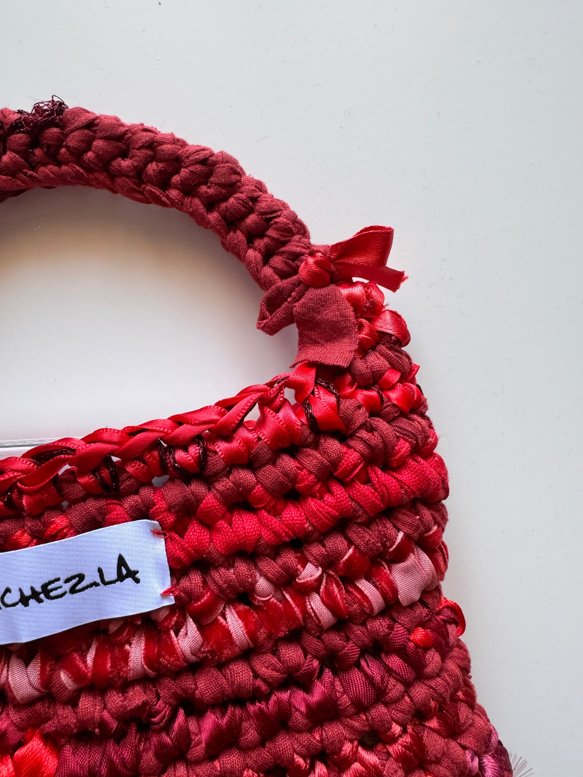 Made entirely of t-shirt yarn and recycled ribbons, it's characterised by a fun pattern and unique texture.