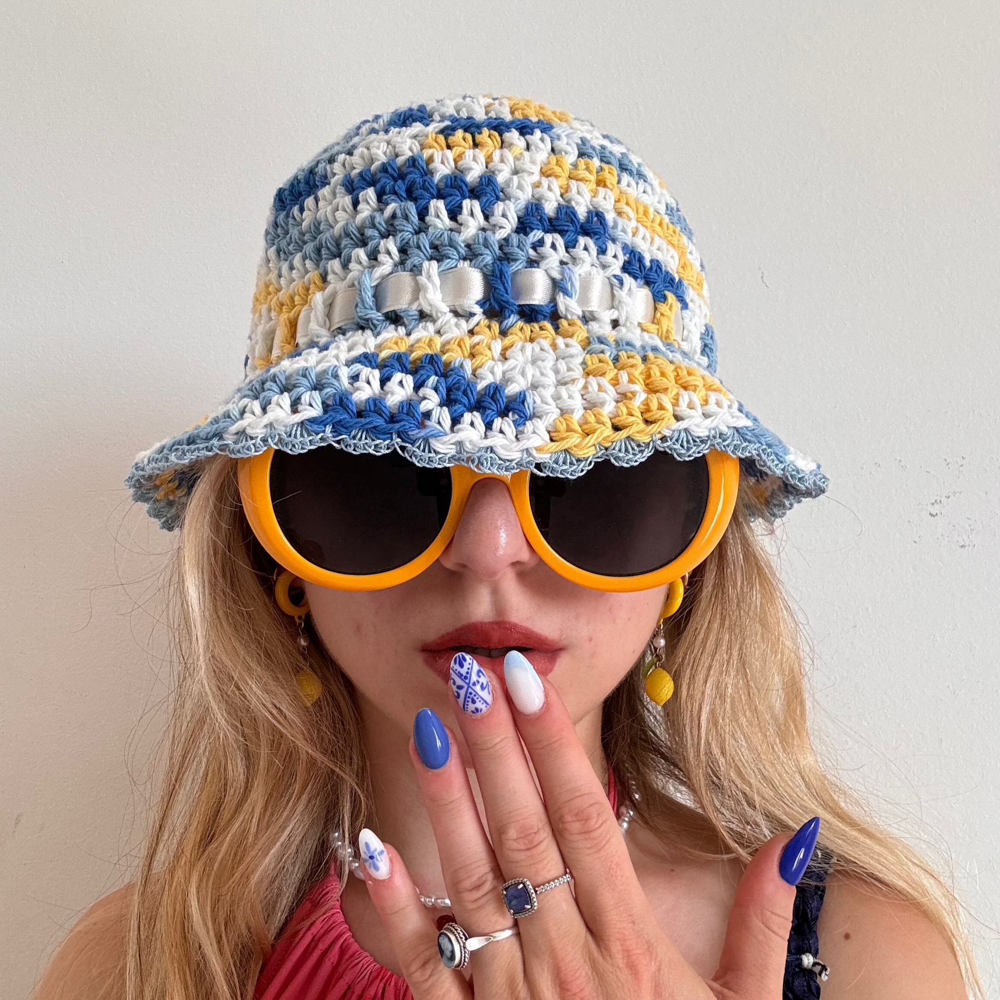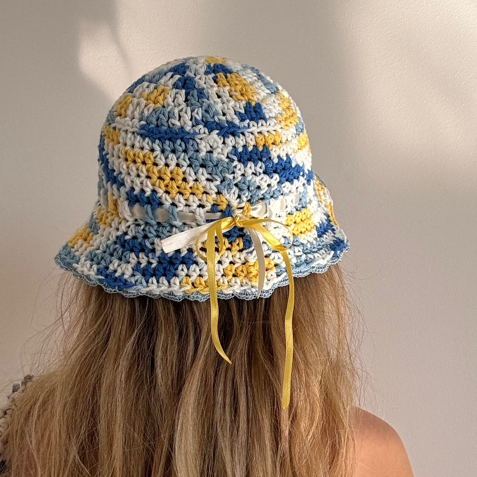 The ribbon bucket hat is made with 100% high quality cotton yarn and upcycled ribbons.