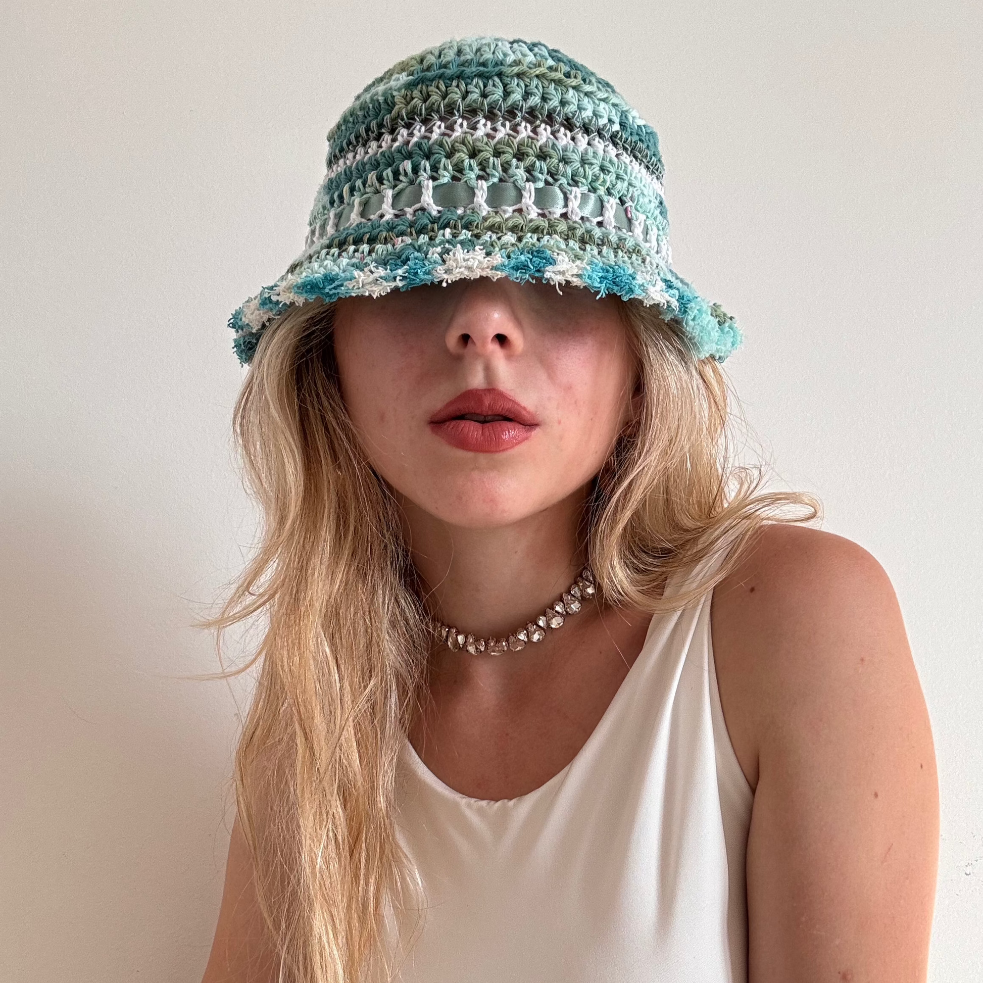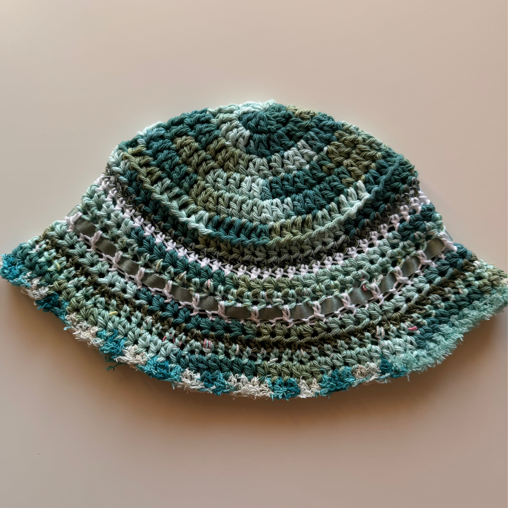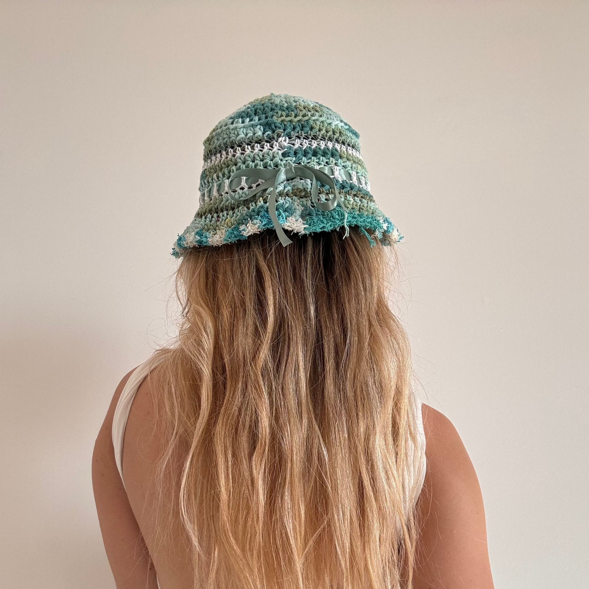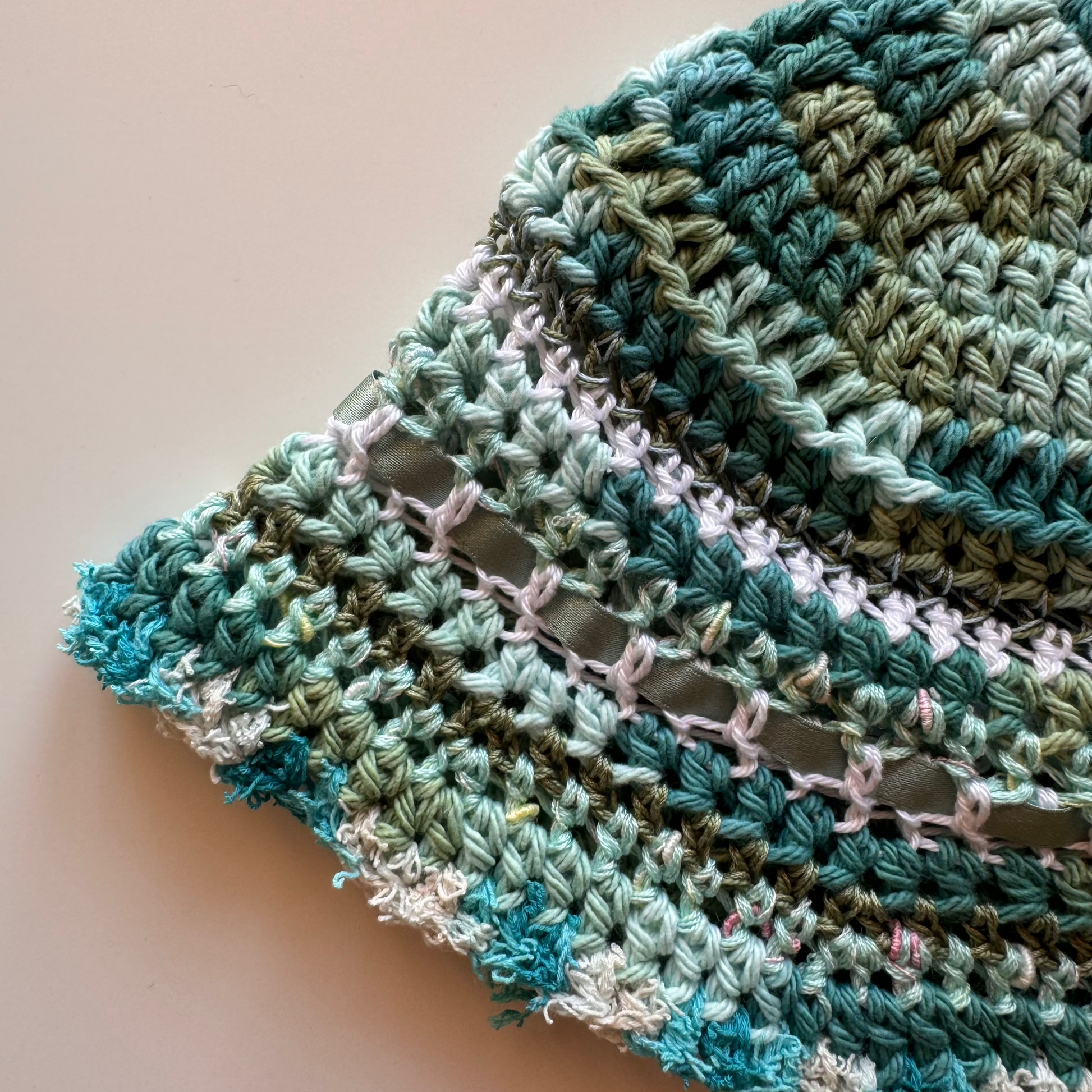 The ribbon bucket hat is made with 100% high quality cotton yarn and upcycled ribbons.