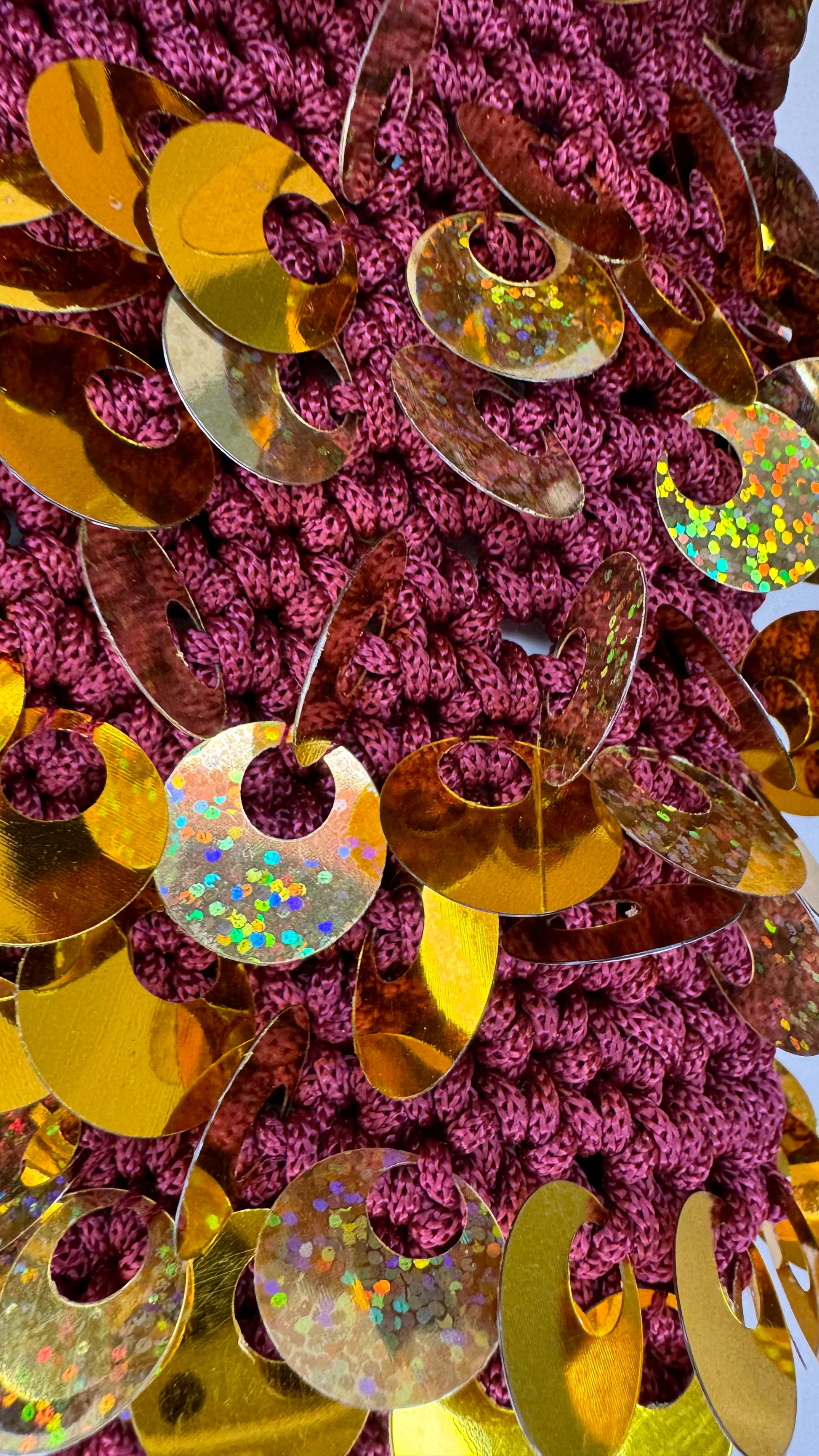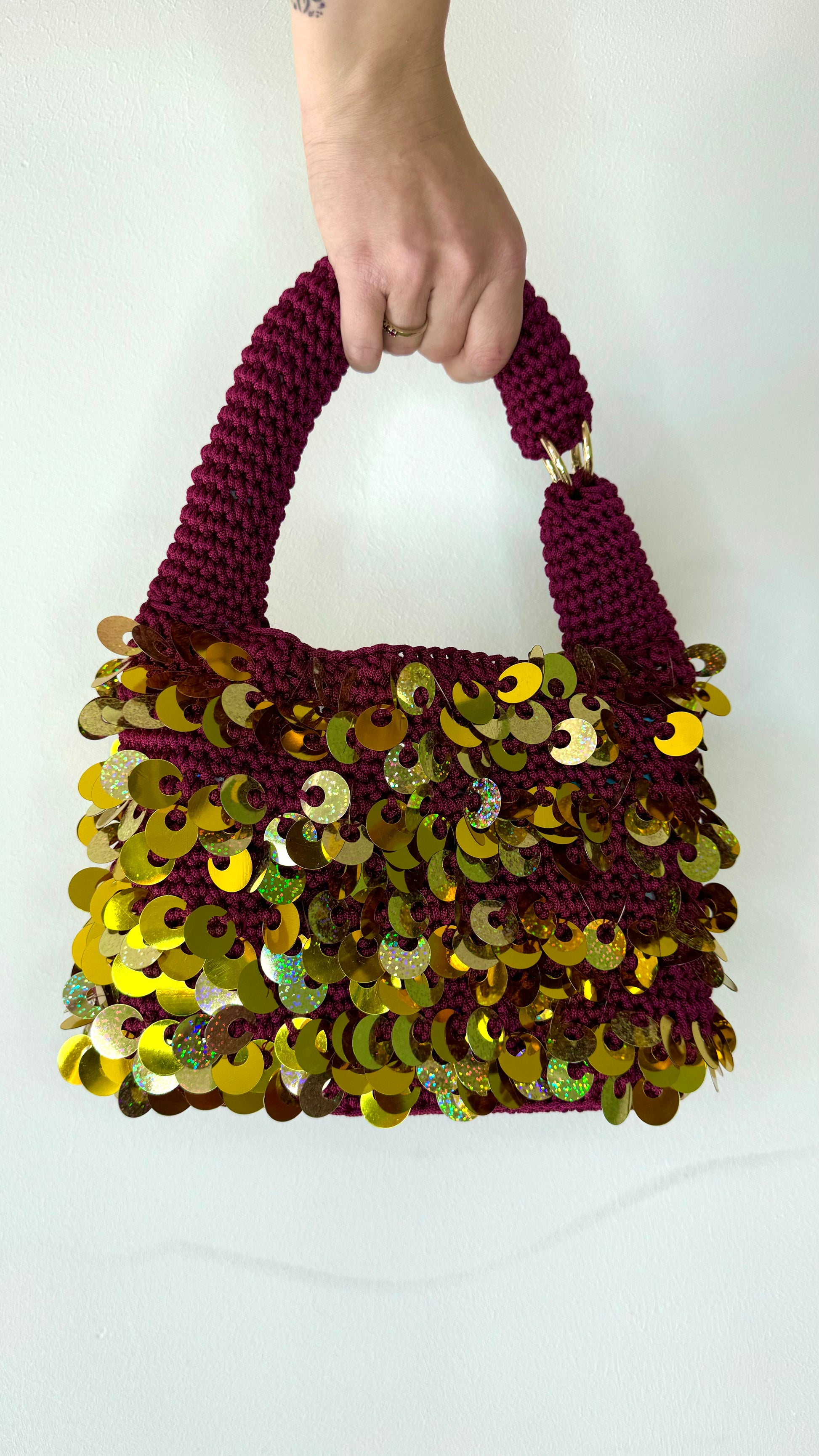 A Burgundy thai chord guarantees a sturdy structure and the gold confetti upcycled into sequins give that shimmer that is going to give the wow factor to all your outfits.