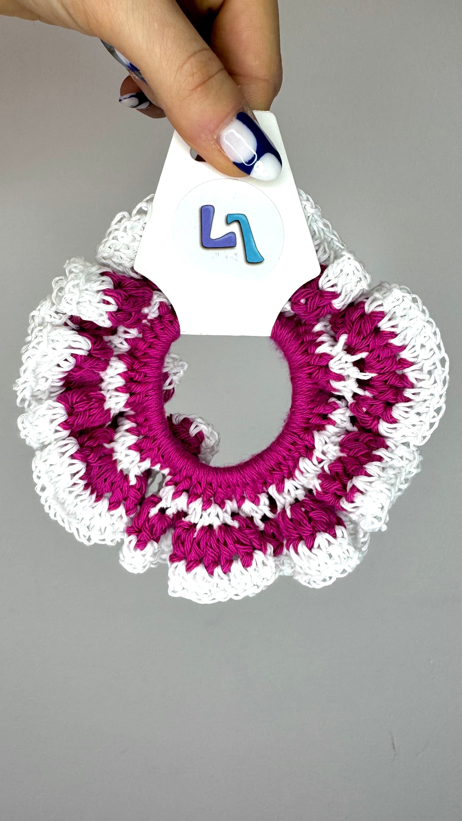 Handcrafted scrunchie made with upcycled cotton yarn.