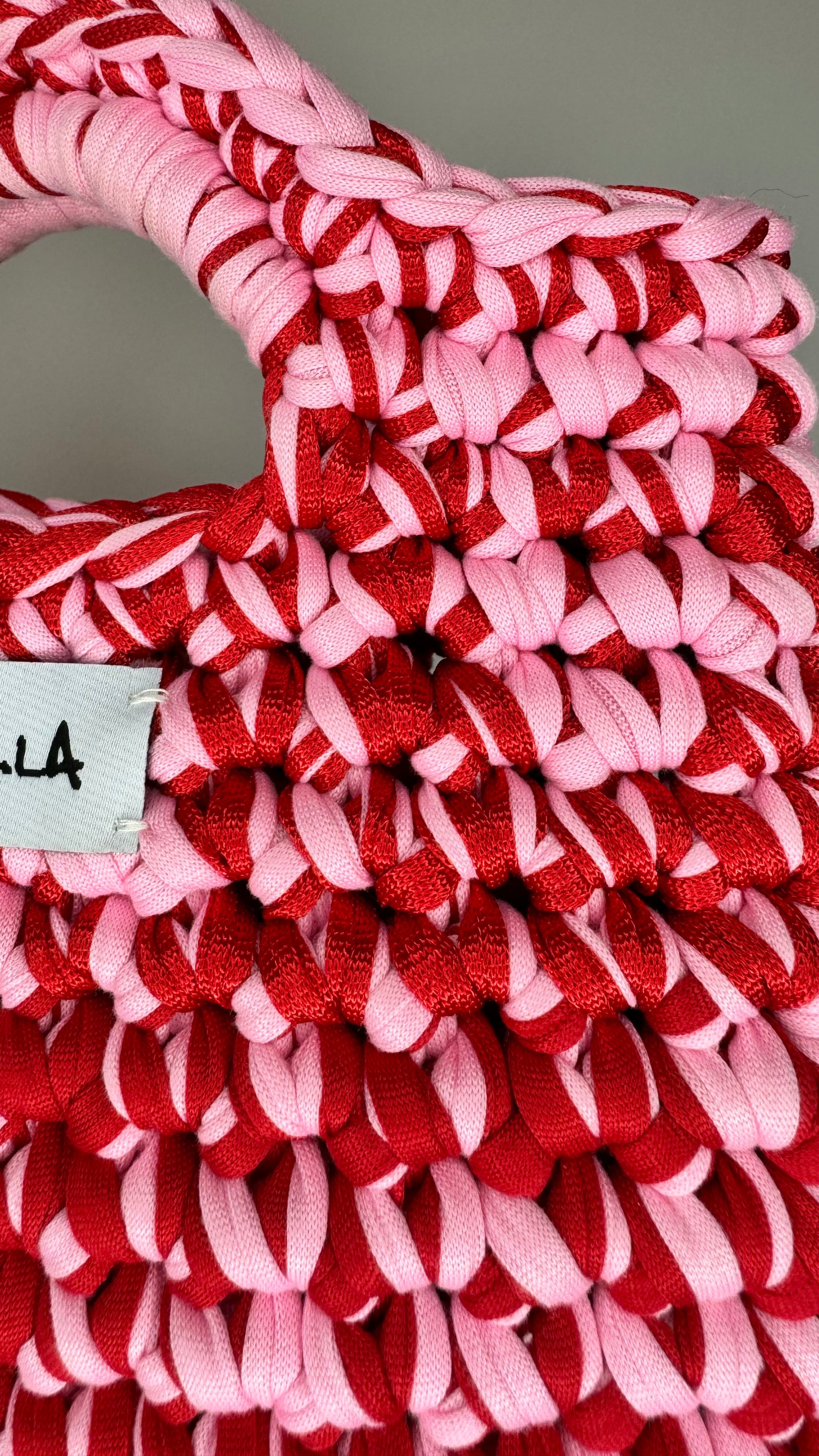 Made out of T-shirt yarn and thai cord, it's characterised by this game of colors and a fun pattern.