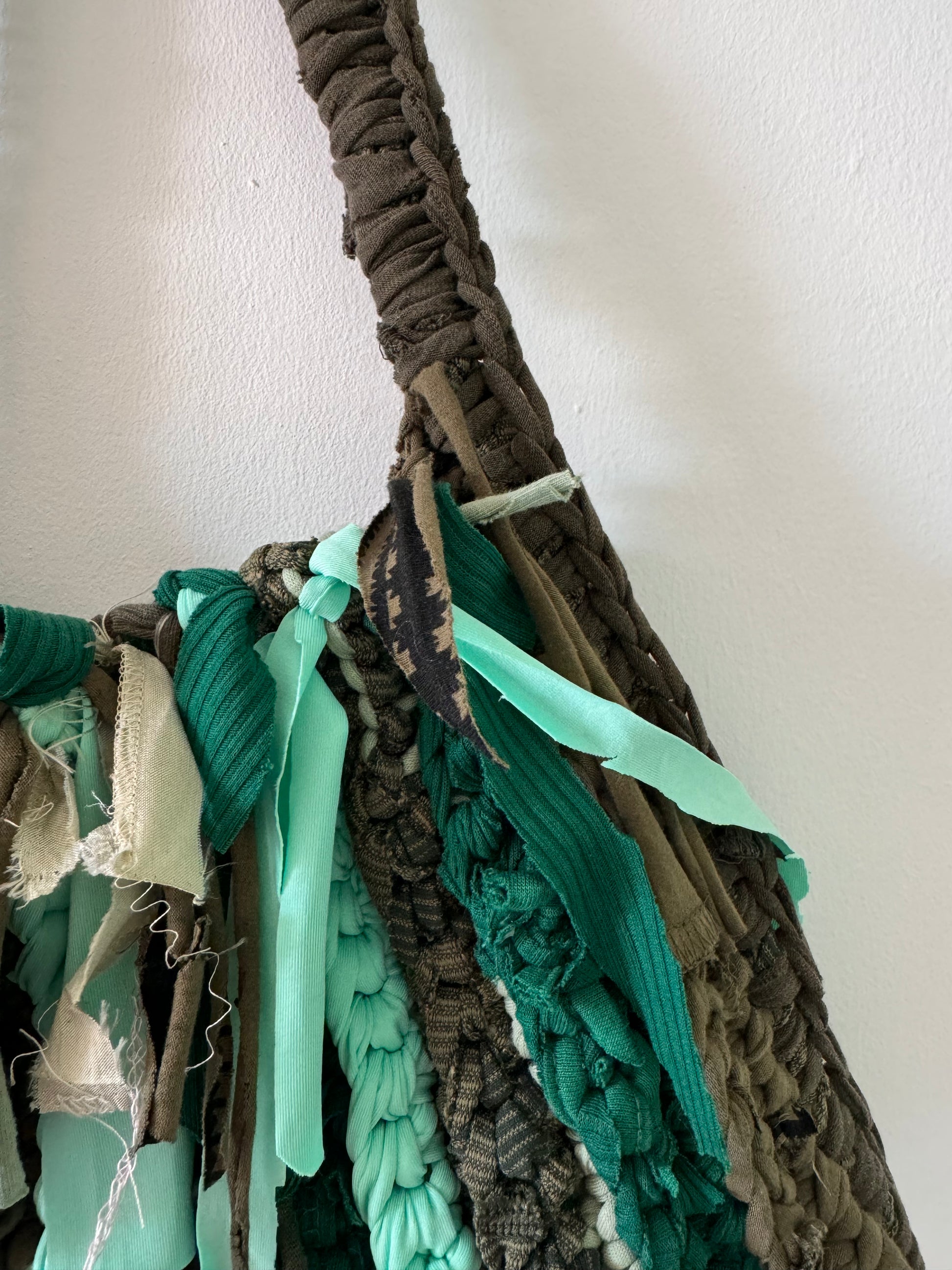 Made entirely of handmade up-cycled t-shirt yarn and yarn scraps, it's characterised by a unique fringe texture in the front and a "cleaner" look in the back.